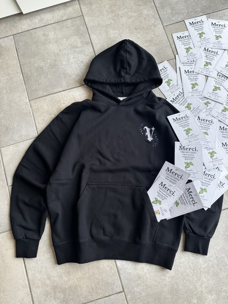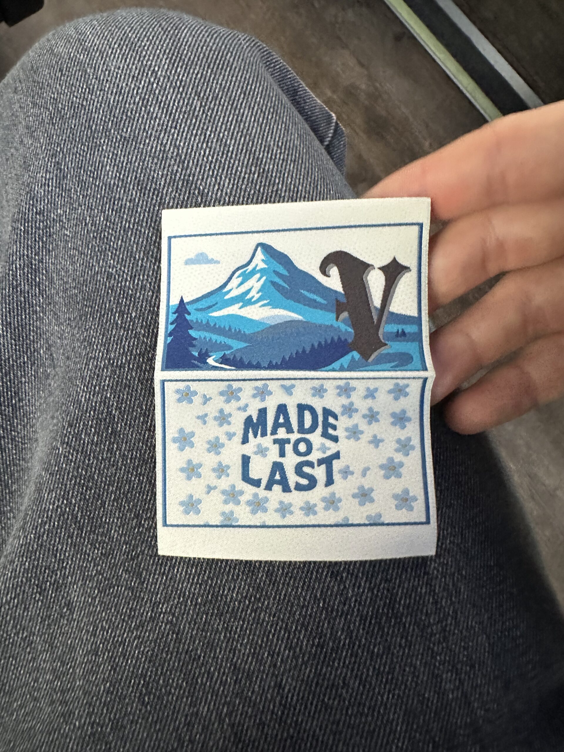 Au verso, le slogan “Made To Last” rappelle notre volonté de créer des pièces durables, accompagné de motifs floraux qui font écho au concept du papier ensemencé présent sur nos étiquettes.